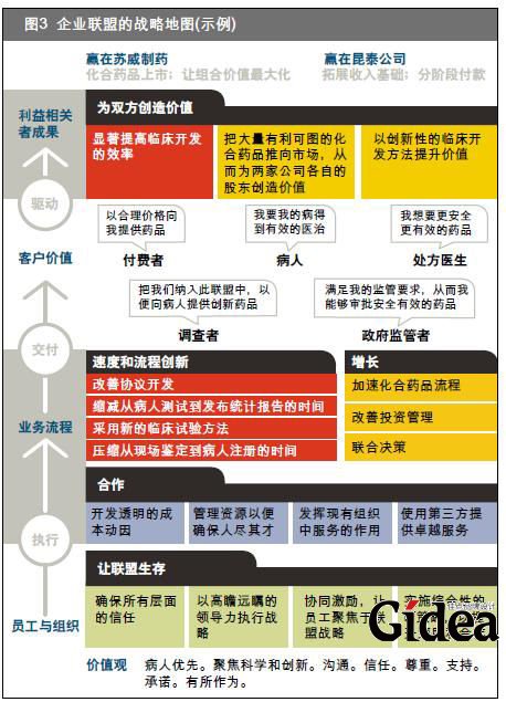 2006年,两家公司意识到,如果双方把供应商合作关系提升到真正的企业联盟关系,将会给双方创造更多的价值。他们引进平衡计分卡战略管理体系,管理其联盟战略。经过一系列的研讨和访谈,双方共同组建的联盟项目团队确定了该联盟的多个战略目标,并把这些战略目标归纳为五个战略主题:让联盟生存、合作、速度和流程创新、增长、双方价值。双方就联盟的目标、指标、目标值、行动方案达成一致的过程中,展开坦率的对话,增强了互信,改善了合作,并在绩效上取得了显著的成果,如临床研究的周期时间就缩短了40%左右。