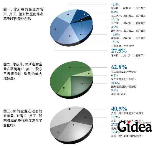 从图一可以看出,40.6%的投票者所在的公司将股东的利益放在客户与员工之后;图三也表明,只有12.4%的投票者认为其所在公司过去五年更注重股东权益;而在日常管理中,当客户、员工、股东三者权益发生矛盾时,只有17.1%的投票者选择优先保证股东权益(见图四)。在对“你认为企业对客户、员工、股东重视程度的最理想状态”这一问题的回答中,有37.2%的投票者将股东权益放在第三位(见图五)。