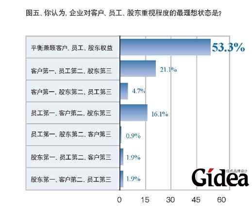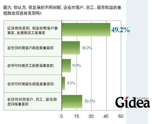 53.3%的投票者认为企业对客户、员工、股东重视程度的最理想状态是平衡兼顾客户、员工、股东权益(见图五);69%的投票者认为平衡三者利益是可能的;49.2%的投票者认为三者何者为先,在不同时期会有不同侧重,很难笼统地说谁是第一(见图六)。