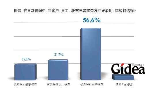 图一显示,将客户利益摆在首位的共占46.9%,远远多于将股东利益放在首位的24.5%,以及将员工利益放在第一的13.5%。此外,有56.6%的投票者表示,在日常管理中,当三者权益发生矛盾时,会优先保证客户权益(见图四)。可见,在任何时候,客户都被摆在“上帝”的位置。