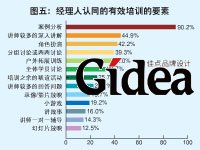 对于列出的19类培训需求,经理人的选择由高到低如下(见图四):1、领导力(62.4%),2、沟通/讲演/谈判(48.5%),3、企业战略(45.6%),4、外语(43.3%),5、财务管理(42.9%),6、时间管理/效率管理(42.1%),7、战略规划(38.8%),8、人力资源管理(38.3%),9、项目管理(36.0%),10、团队合作(30.6%),11、销售技巧(29.1%),12、产业及行业趋势(29.0%),13、职业发展(28.5%),14、国际营销/出口管理(23.5%),15、本公司文化(15.2%),16、质量管理(14.8%),17、电子商务(13.1%),18、本公司产品及服务(10.0%),19、电脑/信息技术(9.8%)。