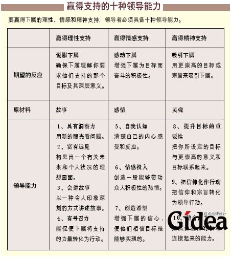故事、感情和灵魂是领导者的大理石、颜料和建筑材料,是领导者创造艺术的原材料,领导者借助它们来说服、感动、吸引人们,激发各种类型和层次的支持。所有这些要求领导者具备十种领导能力(参见副栏:《赢得支持的十种领导能力》)。