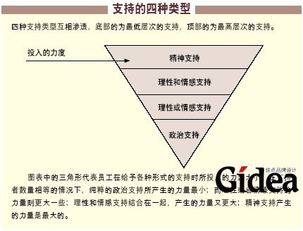 还有第四种,也是最深层次的支持类型-精神支持。在追随者数量相等的情况下,这种支持所产生的力量是最大的。在哈佛商学院的Mobius领导力论坛上,乔布拉(Deepak Chopra)对此做了一个热情洋溢的主题演讲,他说:"领导者是一个团队的灵魂象征,他对变革起到了催化剂的作用。"