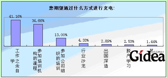 更多的职场人士选择在工作之余以自学的方式充电,期望通过参加培训机构课程来提升自己的占到35%,参加公司组织的培训占到13%,还有少量人士通过行业沙龙、出国深造、和脱产学习等其他方式来提升自己。