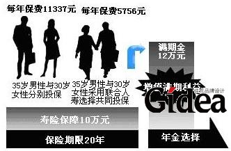 而31岁的男性和28岁的女性若联合投保新华“全家福联合寿险”(终身寿险),选择保额10万元,30年缴费,年交保费只要2100元,而同类终身寿险两人分开投保总保费合计需要五六千元。