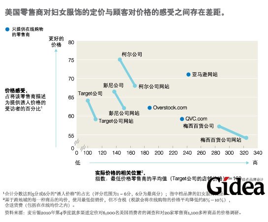 比如,我们可以看看消费者是如何看待美国领先的妇女服饰销售商的(图表2)。尽管柯尔(Kohl’s)公司和彭尼公司(JCPenney)的实际平均价格类似(x轴),消费者却可以清楚地感受到柯尔提供的价格更低(y轴)。亚马逊网站(Amazon.com)——通常跻身消费电子产品等类别的最低价格之列——可对于相似类型服饰的收费却比柯尔和彭尼高,但亚马逊在我们调查的消费者中却依旧享有价值“光环”。