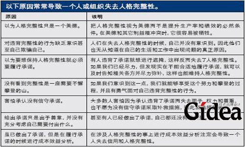 为了阐明这个问题, 詹森教授使用了“ 人格完整性” 这个概念, 并将其定义为信守承诺。这种承诺既包括你所说的话, 也包括你虽然没有说但是传达出信息让人相信你会做或者遵守的事情, 同时还包含他人对你的合理期望( 即使没有表达出来)。当你的所行违背了你说的话,违背了别人相信你会做或者遵守的事情或他人对你的合理期望,而且你在违背了之后没有及时承认并尽力挽回可能造成的影响,你就失去了人格的完整性。