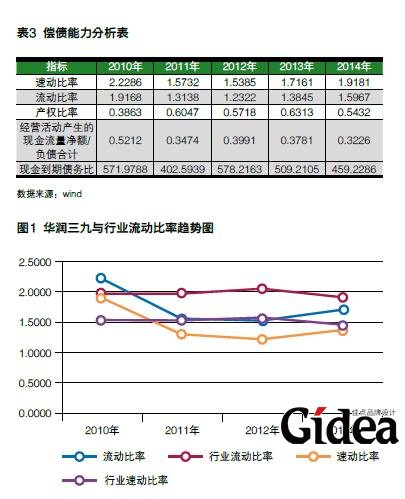 从图1可以看出,华润三九的流动比率与速动比率均在行业平均之下,在一定程度上说明华润三九的偿债能力较弱。“基于医药业高收入、高风险、长周期、高回报的特征,公司短期偿债能力低可以接受”,但是长期而言,公司应努力降低负债水平,将短期流动性风险控制在一定范围内。