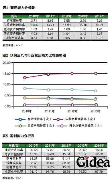 偿债能力分析:本文主要选取速动比率、流动比率、产权比率、经营活动产生的现金流量净额/负债合计,以及现金到期债务比这5个指标来分析华润三九的偿债能力。一般而言,产权比率越小表明公司的偿债能力越强,其余指标与偿债能力呈正向变动关系。从表3可看出在2010~2014年间,华润三九的偿债能力基本呈现走弱的趋势,特别是最后两个指标值,可以较充分地说明公司偿债能力的降低。