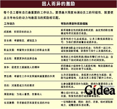 除此之外,员工的工作动力各不相同,每种动力相应的表彰和奖励方法也不同。某种激励对一些员工起作用,却对另外的人无能为力;能调动某人的积极性,却可能打击另一人的积极性。