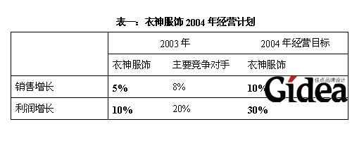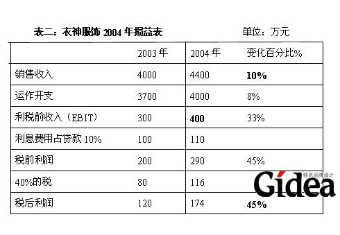 总经理金理先生向古东先生提交了衣神服饰2004年的损益表(表二),衣神服饰2004年的销售从4000万增加到4400万,增长为10%,利润从120万增加到174万,增长为45%。从损益表可以看到金理先生确实达到了销售增长10%上海样本设计的目标,利润增长目标超过了30%。