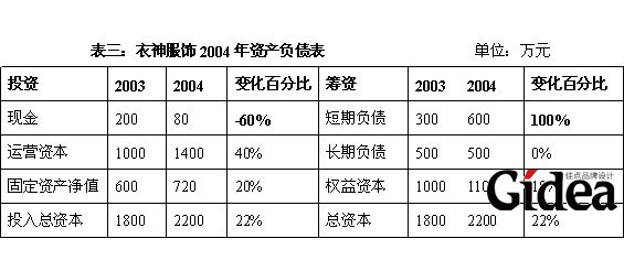 现在,我们可以很清楚地明白,金理先生在2004年并没有为古东先生的衣神服饰创造任何价值!因为公司12%的投资回报率还不能弥补公司13%的筹资成本。我们的分析结论是:从损益表来看,金理先生是一个不错的管理者,但是从资产负债表来看,他却是个不负责任的管理者。