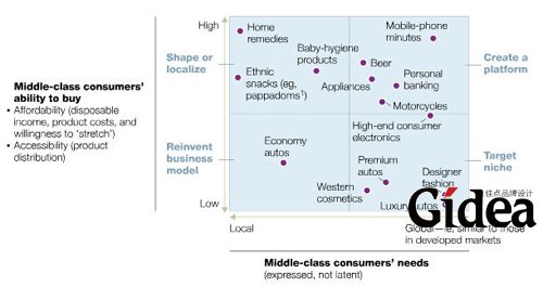 对于需求本地性且购买能力较低的中产阶层消费者,企业可以采取再造业务模式的战略,通过衡量现有全部消费,审视能够满足消费者类似需求的供选产品,研究收入增长可能开启的潜在支出等等,来确定市场;然后把自己的产品做得更加被买得起和买得到。适用于此象限的产品如经济型汽车。
