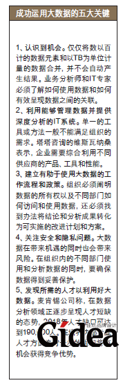 但是处理大数据并不等于只是安装一套系统,然后就能自动获得结果。企业需要使用正确的技术和工具,制定合适的工作流程和政策,物色善于使用分析法和预测分析软件的人才,从而打造产品和服务以满足瞬息万变的市场需求。