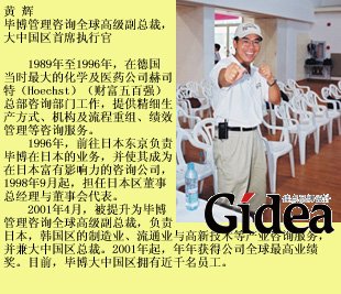 从日本到中国2001年黄辉回国担任毕博管理咨询(前身毕马威)大中国区总裁。那时,毕博刚刚正式进入中国市场,一切还处于起步阶段。"管理咨询在中国还是很新的领域,咨询人员各方面的能力很难和国外相比,所以,刚开始时,辅导和培训的领导手段是必不可少的。"黄辉说。