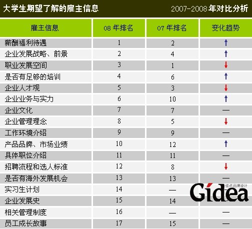 在大学生获取信息的渠道中,网络招聘所占的比例继续呈增长势头,排名第一,占到了总体的近四分之一,其次是各式各样的招聘会等。而且,学生普遍对企业校园宣讲会的形式感兴趣,最希望了解的雇主信息是"薪酬福利待遇"、"企业发展战略、前景"和"职业发展空间",分别名列前三甲。招聘网站在影响大学生择业方面正扮演更重要角色,尤其是网络渠道不是简单的招聘平台,更是一个与学生群体的双向沟通的渠道,对于了解他们的需求和就业心理,进而调整企业的人力资源政策,有着重要的指导意义。