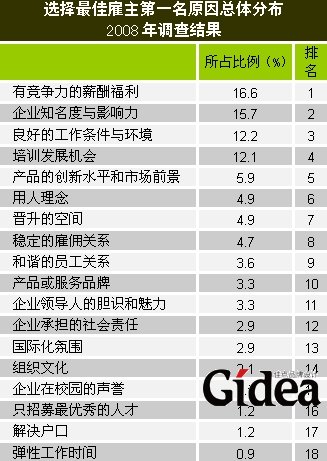 这一组数据将为企业有针对性地调整人力资源政策提供依据。中华英才网人力资源专家张廷文表示,有竞争力的薪酬已成为企业抢夺人才的重要砝码,其实从登上TOP50榜首的中国移动身上可以看出,学生更多是从薪酬福利与品牌实力两个方面考虑是否加入企业。在CPI一路看涨的今天,薪酬待遇更是为初涉社会,自食其力的大学生就业人群所看重。同时,企业知名度及工作环境两项指标比例的跃升,意味着大学生越来越关注环境和职业健康,对工作的满意度和愉悦感有了更高要求。