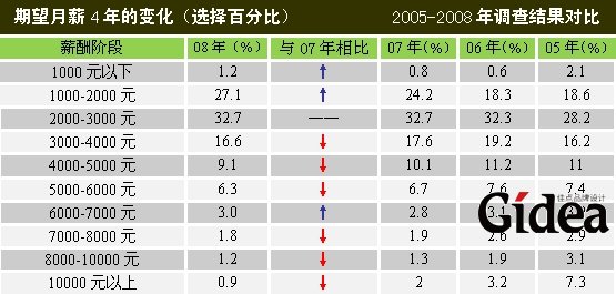 此外,最受关注的大学生薪酬期望值再创新低。在薪酬期望值上,总体呈下降趋势。1000-4000元的选择人数占了77.6%,除了最低月薪比07年的1800元提高了200元外,在3000元以后的水平段上,选择比例普遍大幅降低,尤其是在8000元段上,甚至创造了2.1%的历史新低。这一数据将对就业个体产生指导作用,08年大学生就业心态不宜好高骛远,可根据自身情况适当放低薪酬要求,为自己争取到更多的就业机会以图发展,不切实际的漫天要价可能会与机会擦肩而过。