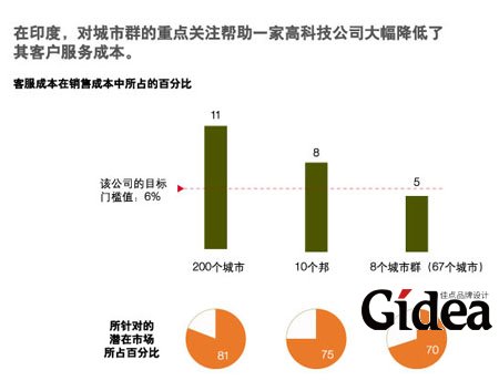 诚然,印度主要的城市群涉及的经济规模不如中国的城市群那样大,到2015年,中国的城市群将占到全国城市GDP的92%。但是,在印度,采用一种中心辐射的方法,应该也能提供类似的机会,可以优化供应链,以及销售和营销网络。例如,一家成熟的高科技企业以前曾在印度全国各地的120个城市运营。最近,该公司转而重点关注8个城市群,这些城市群总共包括了67个城市,它们仍然使该公司获得了其潜在市场份额的70%。这样做有一个好处:客户服务成本从快速增长的占销售成本的9%~10%下降到了更容易接受的5%(图表3)。
