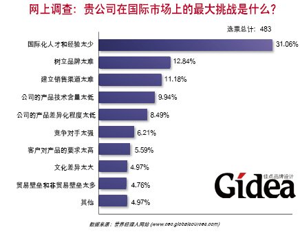 人才、品牌、渠道、产品,可以看到,出口商面临的前几大问题实际上也是国内企业面临的问题。而有出口企业性质的诸如贸易壁垒、文化差异等因素却排在了出口挑战的末位,这其实反映了出口企业在管理经验和方法上的欠缺。而从长远来看,文化差异问题将随着经济全球化趋势的增强而越来越突出。
