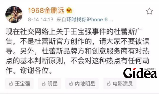 考虑到广大网友对王宝强的支持、同情与鼓励,杜蕾斯及其新媒体团队对此敏感的热点进行了追踪,先是利用假冒的杜蕾斯的海报让网友注意到自身,而之后呼吁品牌“远离”王宝强离婚事件,坚守借势营销道德底线,消除了网友对自身的反感,为自己赚足了网友的好评,真可谓煞费苦心。