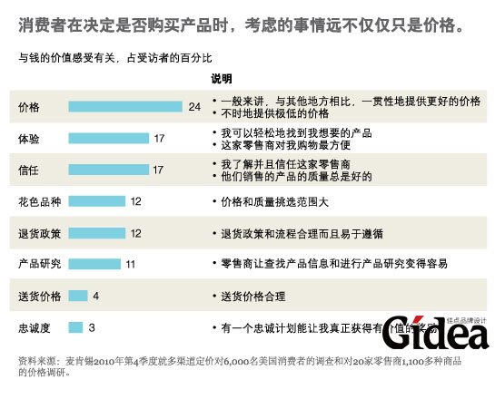 根据我们与数十家离线、在线和多渠道零售商合作的经历,我们发现,它们可以运用某些定价举措来打价值牌。首先是确定关键价值产品——那些对于价值感受影响最大的产品。比如,在消费电子产品中,平板电视和计算机硬盘是吸引消费者光顾商店或者网站的热门产品。第二,必须给这些产品制定具有竞争力的价格,以创建该零售商提供出色价值的公众感受,而对这些产品所打的价格折扣可以通过提高那些关注度不太高的产品价格来补偿。最后,无论消费者选择何种零售渠道:店铺里的价格、网站上的价格或产品目录上的价格应该保持一致。