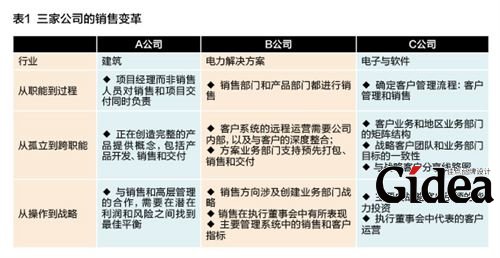 从操作转向战略活动 根据销售情况的复杂性,这些公司正处于不同的成熟阶段。A公司处于复杂过程中的早期阶段,只是引入专业客户管理,并界定了销售流程;B公司已经实施了销售变革项目;C公司则有着复杂的、差异化的销售和客户管理,以及深刻的规划。然而有趣的是,变革销售三个方面中的每一个(从职能到过程,从孤立到整合,从操作到战略),都既出现在销售模式较低级的公司中,也出现在销售和战略客户管理方式更复杂的公司中。