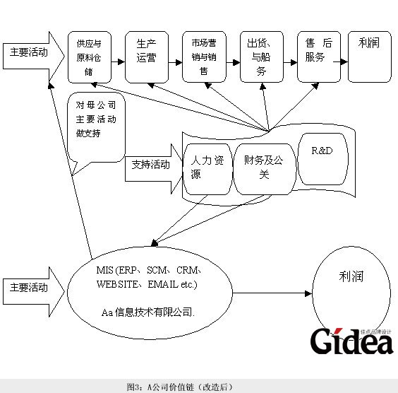 A公司对价值链中MIS环节的改造,使改造后的两个价值链得到了双赢。对价值链的成功改造,不但稳固并大大增强了公司的竞争优势,而且成功的将弱势环节变成了公司未来的利润增长点,并使公司成功切入了朝阳行业IT服务行业,为母公司的多元化发展打好了第一炮。