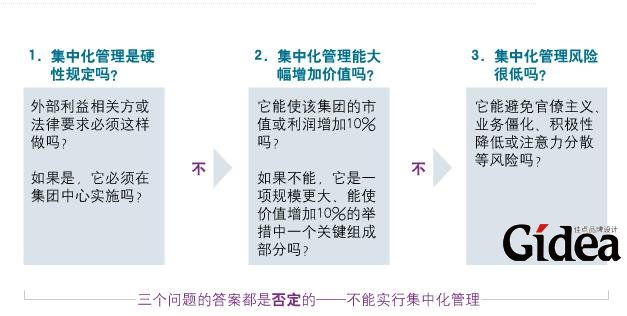 大多数集中化管理提案都无法通过前两个门槛中的任何一个:它们既不是一种硬性规定,也不代表增加价值的主要来源。在更多的时候,值得去争取的好处是在成本或质量上比较小的一些改进。在这种情况下,与集中化管理有关的风险 ——业务的刻板僵化、积极性降低、官僚主义和注意力分散——往往比创造的价值更大。因此,只有当这些消极副作用的风险很低时,才应该采纳这种提案。