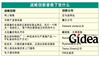战略创新是以全然不同的方式从事现有业务。亚马逊网站从事图书零售的方式与邦诺公司不同。同样地,嘉信理财(Charles Schwab)、easyJet航空公司和戴尔公司从事各自业务的方式分别与美林证券(Merrill Lynch)、英国航空公司和IBM各不相同。