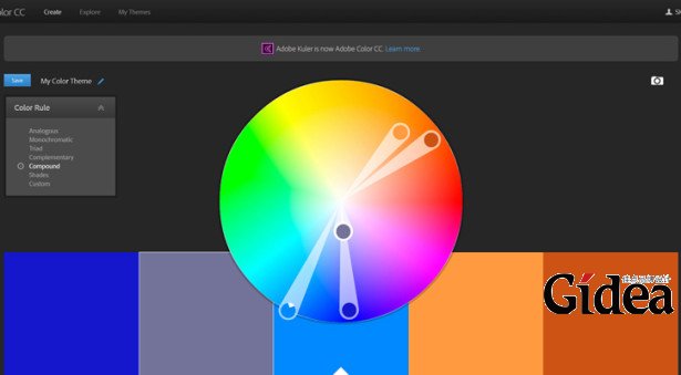 另一个流行的选择是Adobe Color,它有非常相似的设置,但界面有些复杂。你依然需要基于输入一个单色,来选择配色方案。不过Adobe Color使用色轮展示匹配的颜,每一种颜色是灵活的,易于移动的,在维持颜色模式一致性之内。